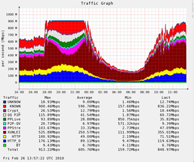 如上图所示,在18:30-22:30,随着高优先级应用(对用户体验影响直接的应用)流量上升,受限应用(棕色的迅雷)流量明显被压缩,流量总量几乎是一条直线,充分利用了带宽资源,同时保障了高优先级应用的带宽。